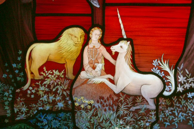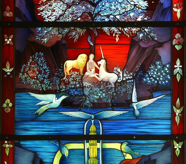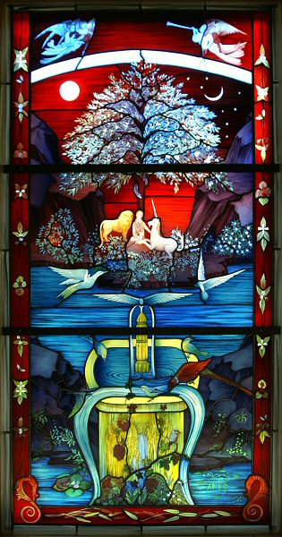 On the occasion I was asked to undertake this project, I had spent several days with the client and saw often a copy of a tapestry of the Lady with the Unicorn. This seemed an appropriate theme and I began with this as the main subject for the window. Several of the motifs and qualities that interested me in the tapestry have been used in the window.