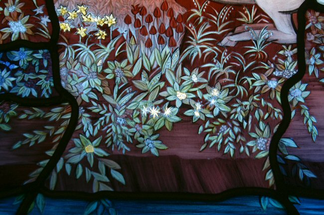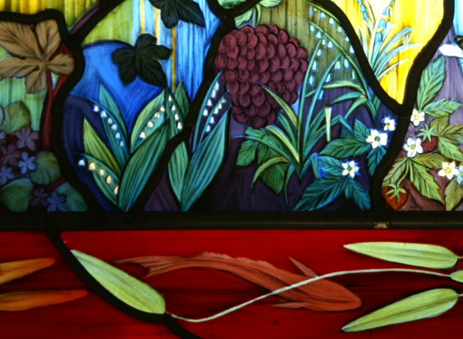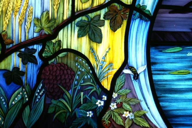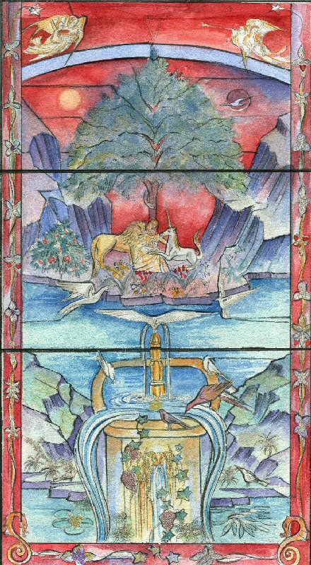 Unicorn A lunar, feminine symbol, with the lion as the male; chastity , purity, virginity, perfect good, virtue, and strength of mind and body; incorruptibility. Unicorns are sometimes depicted on either side of the tree of Life as guardians. The conflict between the lion and the unicorn represents solar and lunar powers and the pairs of opposites. Lion As a solar symbol it represents; masculinity, the heat of the sun, the splendour and power of the noon sun. The fire principle, majesty and strength. They can also be seen as guardians of the Tree of Life and represent vigilance and courage. The symbolic representation of the lion and the unicorn are also underpinned by the presence of the sun and the moon. Lamb, Gentleness, young innocence, meekness, purity, the unblemished. The lamb with the lion depicts the paradisal state. The Serpent When associated with the Tree of Life, its aspect is beneficent. Angels Messengers of God, a link between heaven and this world. The word comes from Angelos which means messenger. Symbols include: flaming swords, trumpets, sceptres, musical instruments, lilies. The Firmament The firmament divides the upper or celestial from the lower or terrestrial waters. The Hebrew word means something beaten or hammered out, it could also be imagined as a great vault of crystal to which the fixed stars were attached. The Fountain representing a source of the water of life that gushes freely forth nourishing the earth. Symbol of waters of life, immortality and eternal youth The Tree The tree of life and the tree of knowledge grow in Paradise. , the tree of life is at the centre and signifies regeneration, the return to the primordial state of perfection. the tree of life, which bare twelve [manner of] fruits, [and] yielded her fruit every month: and the leaves of the tree [were] for the healing of the nations. Rev 22:2 The Birds Linking Paradise with our world. Birds can represent the human desire to escape from gravity and the laws of this physical world, to reach the level of the angel. Border Violets, dogwood and strawberries, at the base water-plants and fish. The symbol of the bee was important to the commissioner and several are included. Other Symbols Wheat and Grapes are traditional Medieval symbols. Fish and a frog on the lily pad, a robin and a kingfisher. Lily of the valley, strawberries and violets. The two Dragons at the base are representations from the staircase feature within the house. Flowers and Blossom both symbols of young life and may represent spring and the fragile nature of childhood. The flower is often a symbol of beauty and the colour adds to the symbolic meaning, red is love and passion, white is innocence. Technique