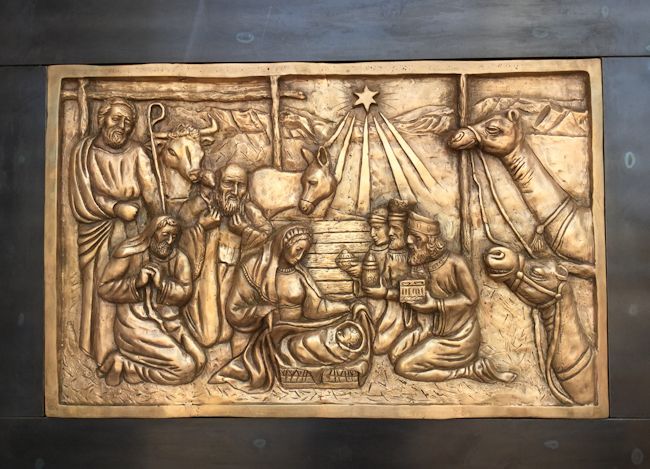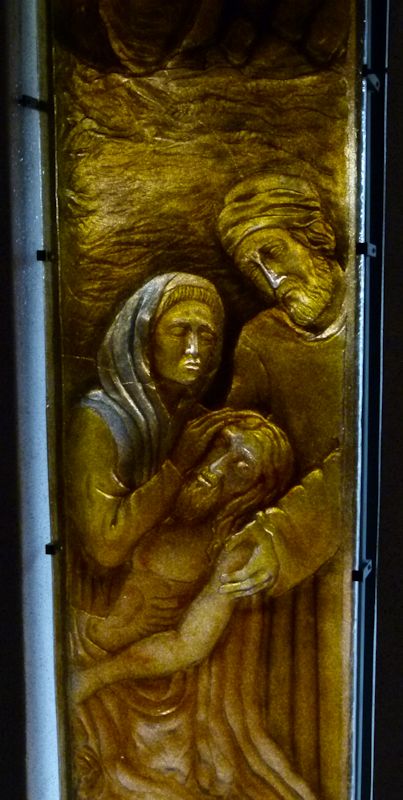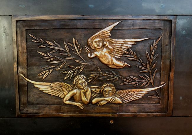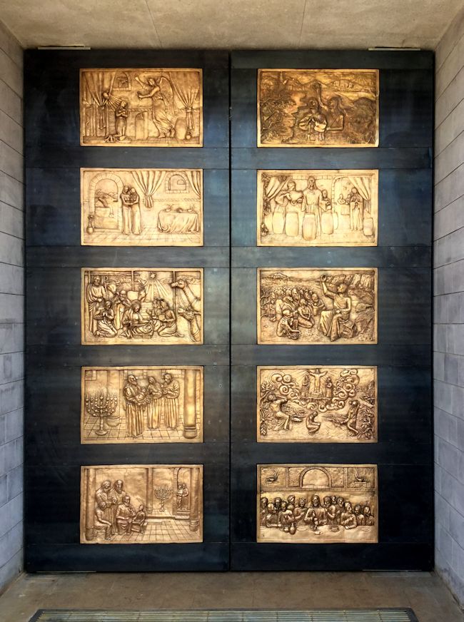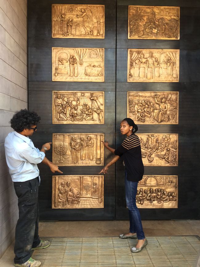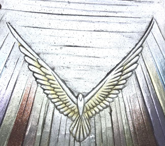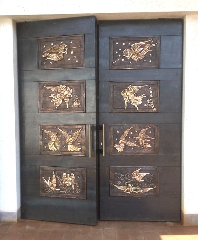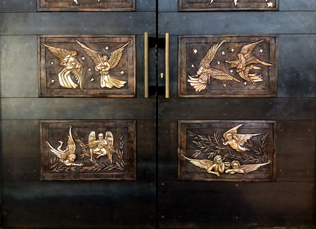 The cathedral has two sets of steel doors, there are relief sculpted bronze panels inserted into these doors. The method of creating the art work for these panels is similar to what is required to make the glass relief sculptures.