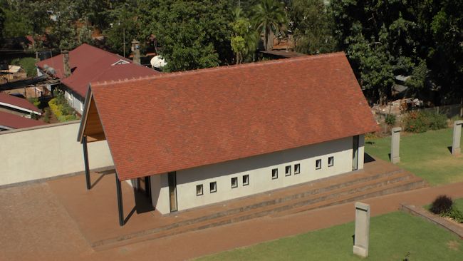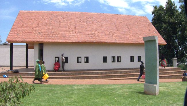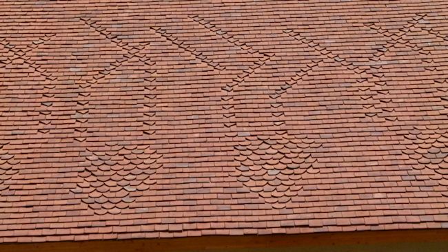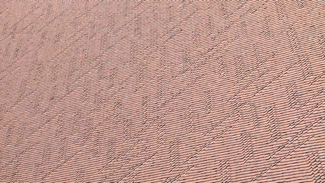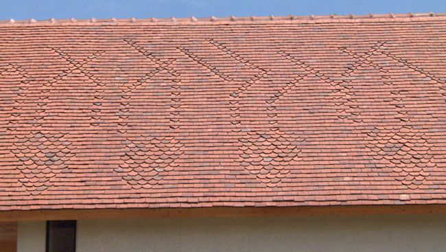 The roof for the cathedral has this outer layer of terra-cotta tiles from Kenya Clay. It was felt that the tiles should not be left simply in this natural state, so we created a design based on cutting the tiles.