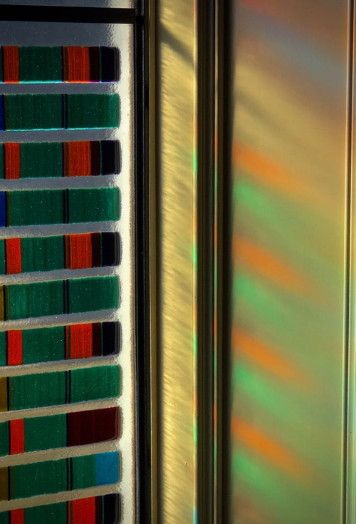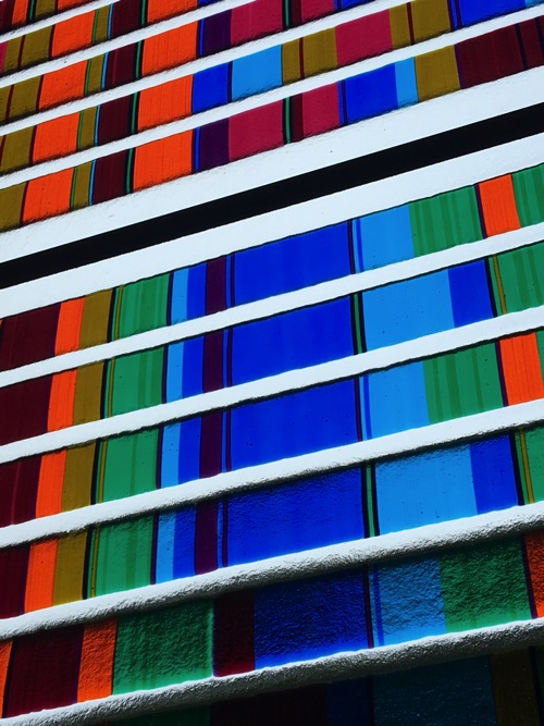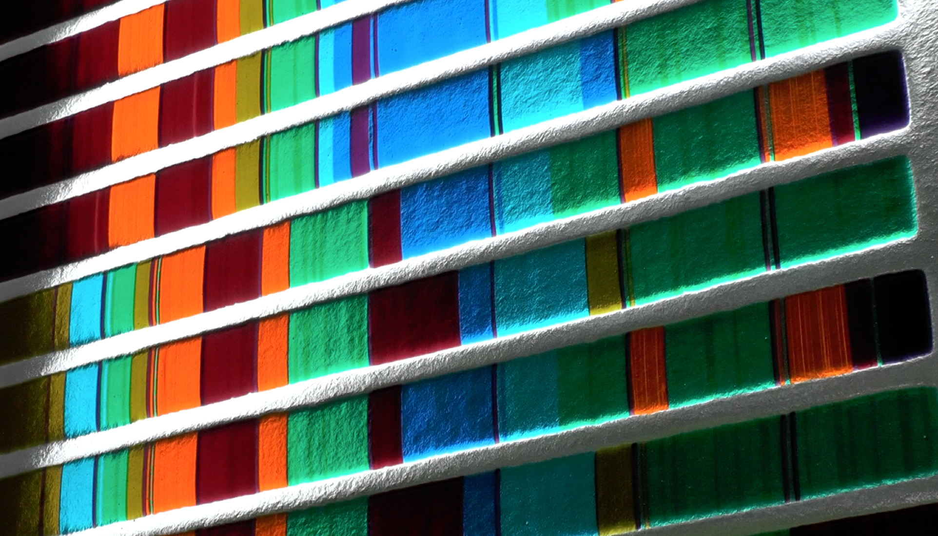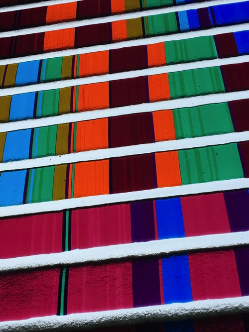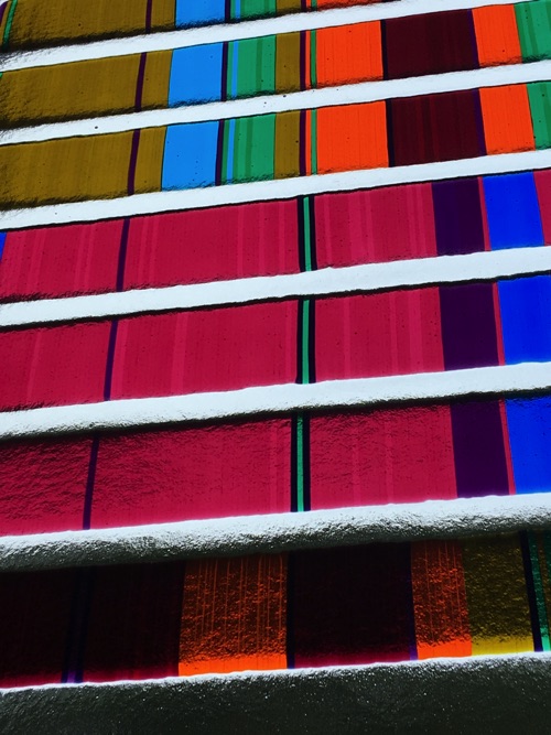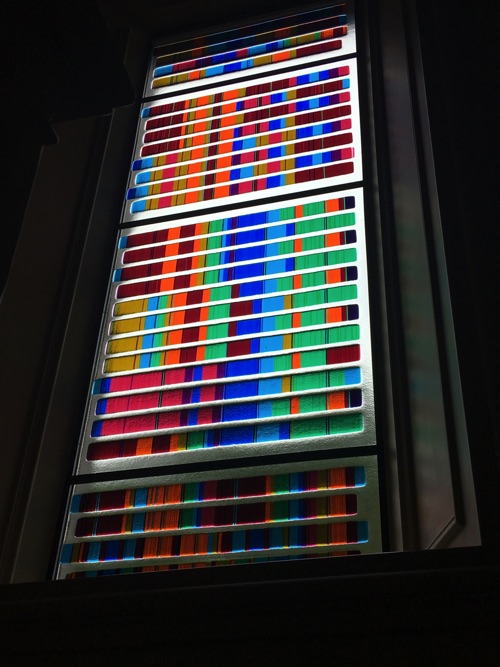 The window is made of Bullseye Glass. A glass conceived from the beginning to be able to fuse together, melt together. Most other glasses cannot be so readily fused and will break apart on cooling. The use of Bullseye Glass enabled this combination if colours to be fused together to create permanent sheets that have been installed here.