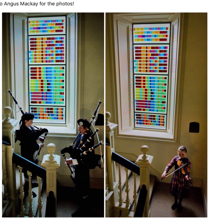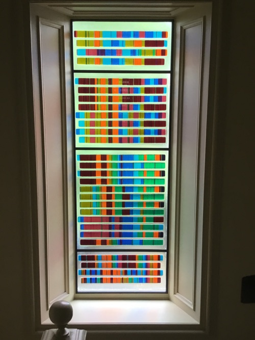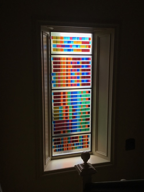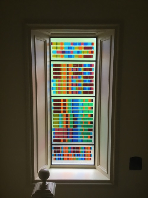 This window is the first large scale manifestation of a unique concept transforming written music notation into colour. In this case, the music is four bagpipe tunes. The window is located in a beautiful old house in Caithness, Scotland.