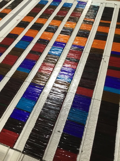 The transformation of musical notation into colour puts me as the artist into the position of a musician staring at the notes on a sheet of paper. Whereas a pianist or other musician plays the notes, I place them together to make a pattern. I can decide how many bars there are represented on a line, but the colour result using the system is inevitable.
