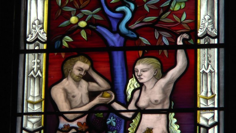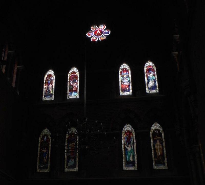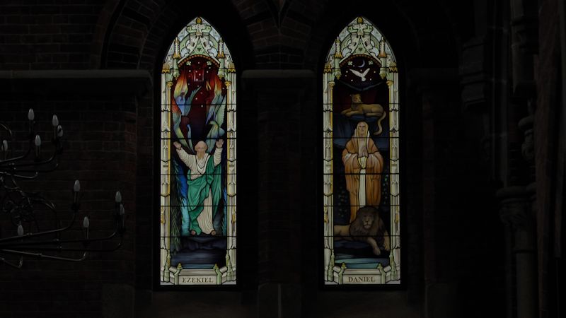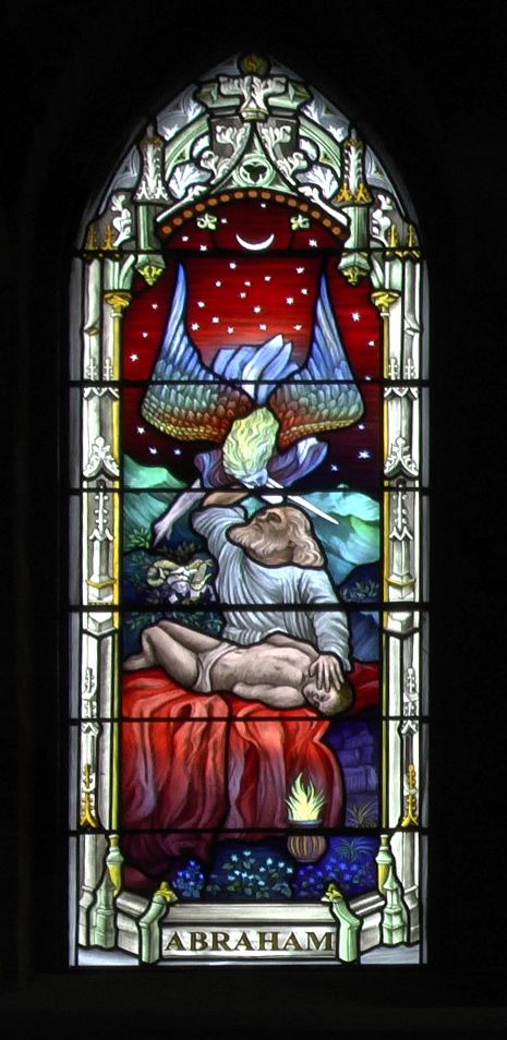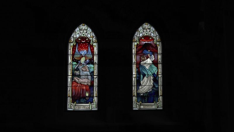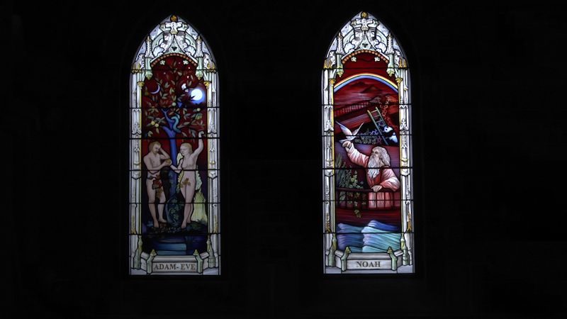 There are representations of themes from the Old Testament characters who had direct contact with God the Father: Adam and Eve, Noah, Abraham and Moses. These windows are in the upper row. The lower row of windows contain what are known as the Four Major Prophets. These are: Isaiah, Jeremiah, Ezekiel and Daniel.