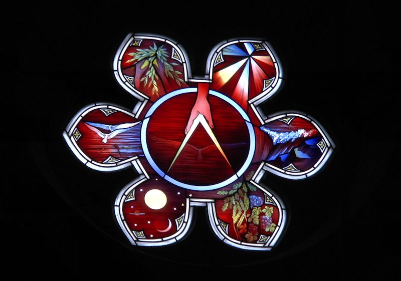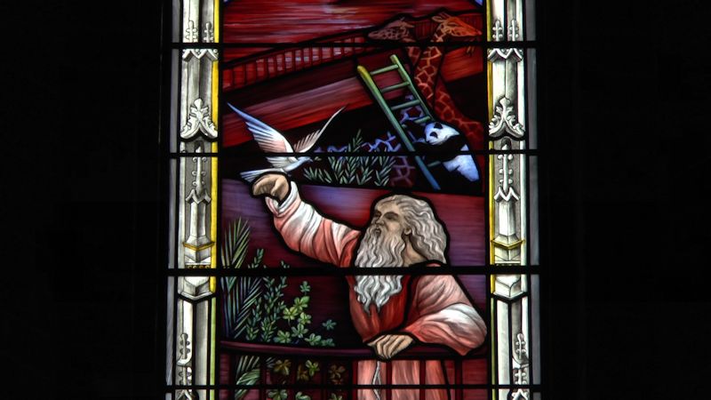 This window shows the moment that Noah catches the dove with the olive twig in its beak indicating that the flood was abating. The scene shows the earth still covered with water with only the peaks of the mountains showing through. The rainbow is in the sky as the symbol of the covenant between God and Humanity that the earth would never again be destroyed.