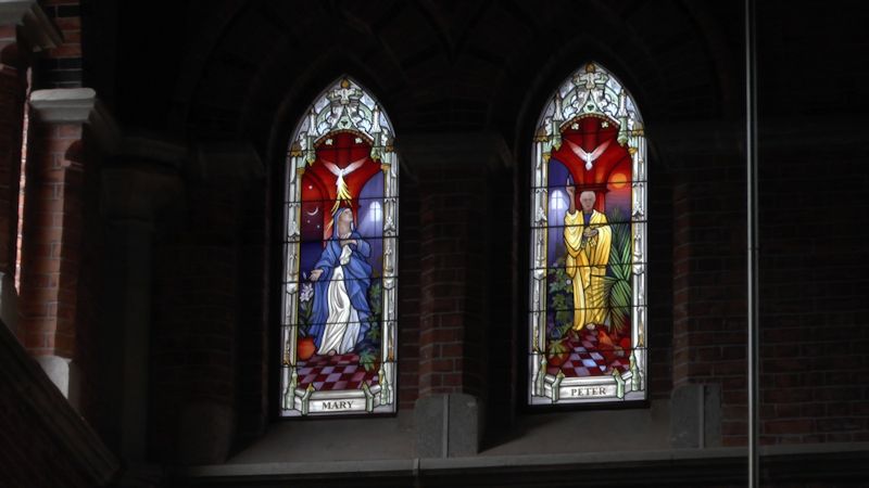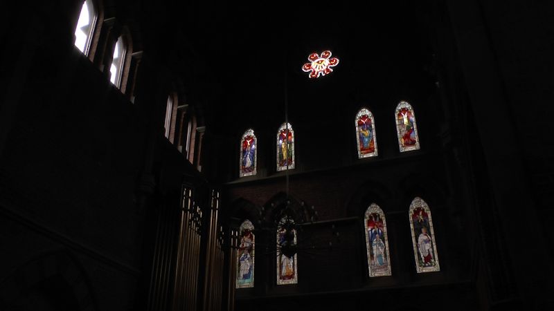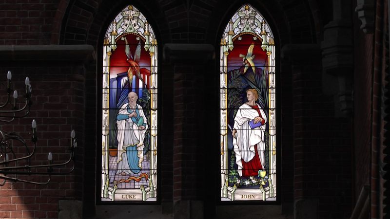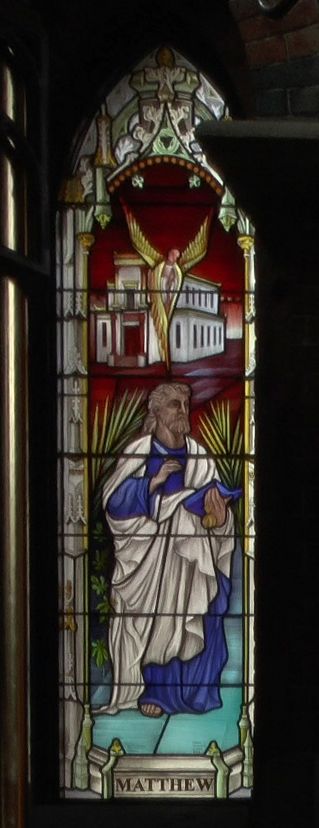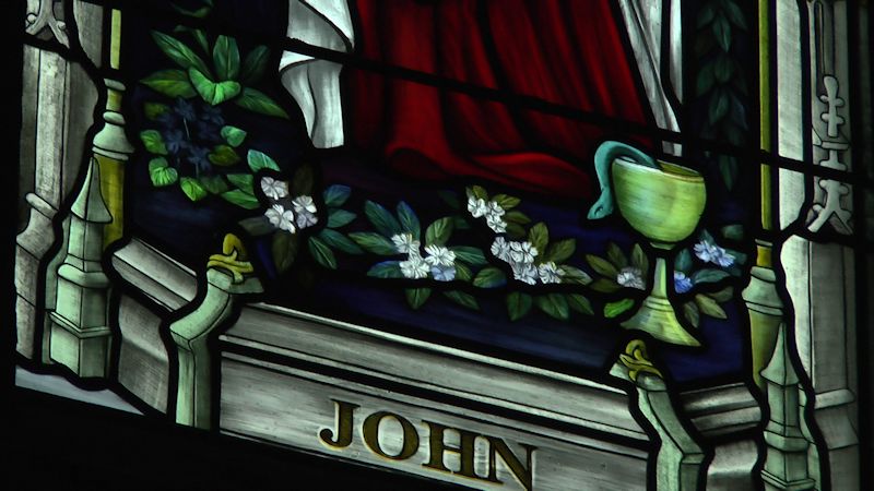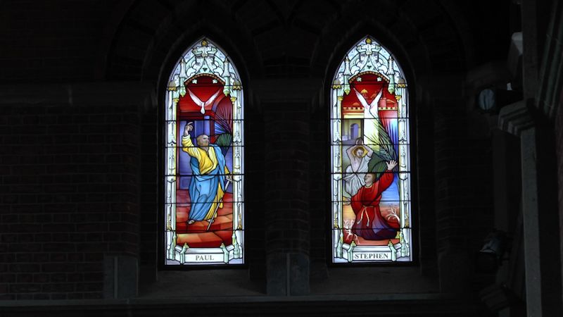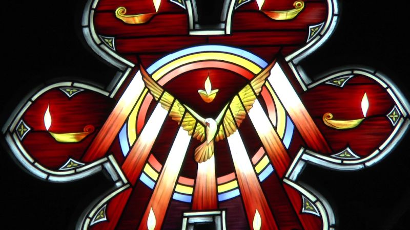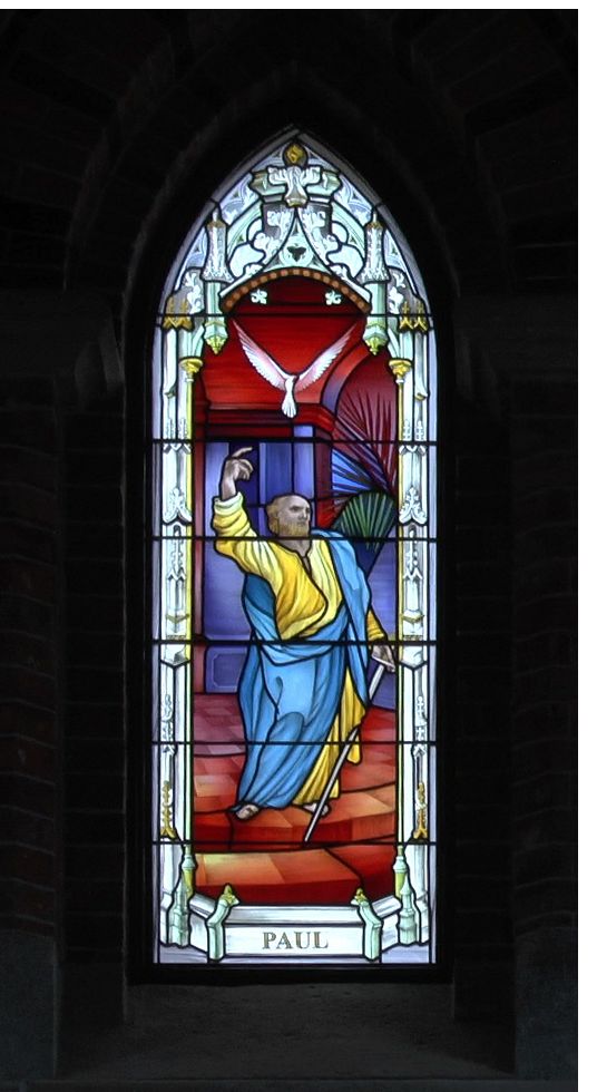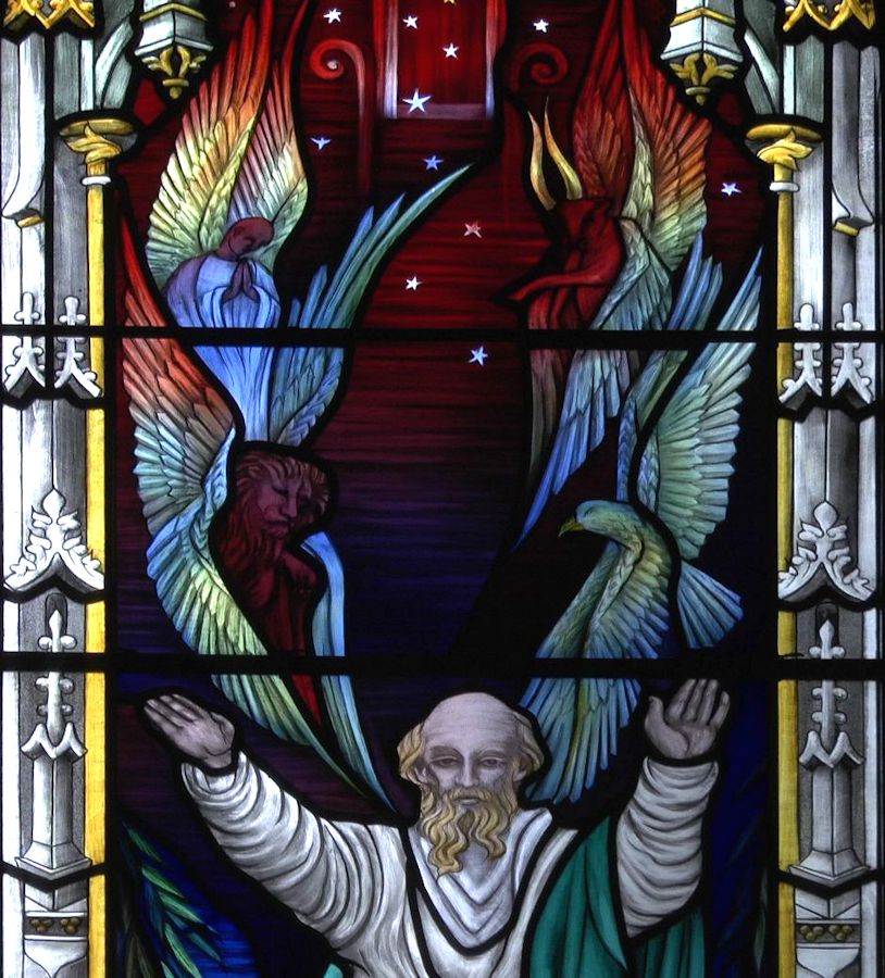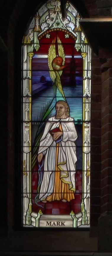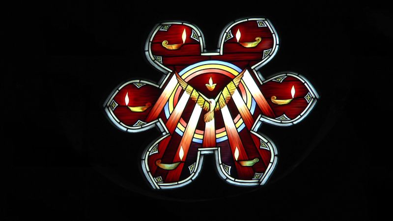In the Holy Spirit windows, the themes in the upper row are taken from the time following the death and Ascension of Christ. They depict: Mary, Peter, Paul and Stephen. The lower row of windows have depictions of the Four Evangelists: Matthew Mark, Luke and John. In both transepts there is a traditional rose window at the top, these have a theme relating to the main narrative of the windows below. The East Rose is taken from the theme of Creation and depicts the Six Days of Creation. The West Rose shows the descent of the Holy Spirit first manifested at the Baptism of Christ but the promised helper to the apostles following the death of Jesus. The lamps represent the Seven Gifts of the Holy Spirit and the gifts of the Holy Spirit. John 14:15-17 Jesus Promises Another Helper 15 “If you love Me, keep[a] My commandments. 16 And I will pray the Father, and He will give you another Helper, that He may abide with you forever— 17 the Spirit of truth, whom the world cannot receive, because it neither sees Him nor knows Him; but you know Him, for He dwells with you and will be in you. In this description of the windows, I will include quotations where relevant to explain my thinking and to clarify the images created within the windows.