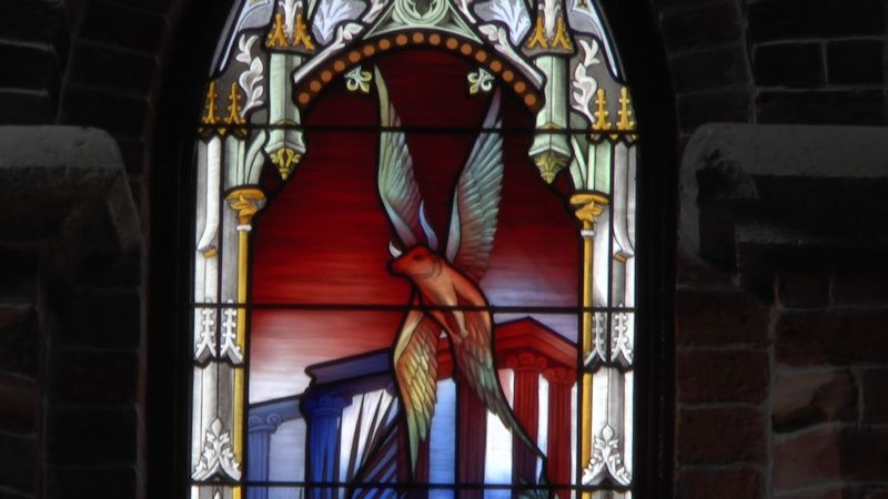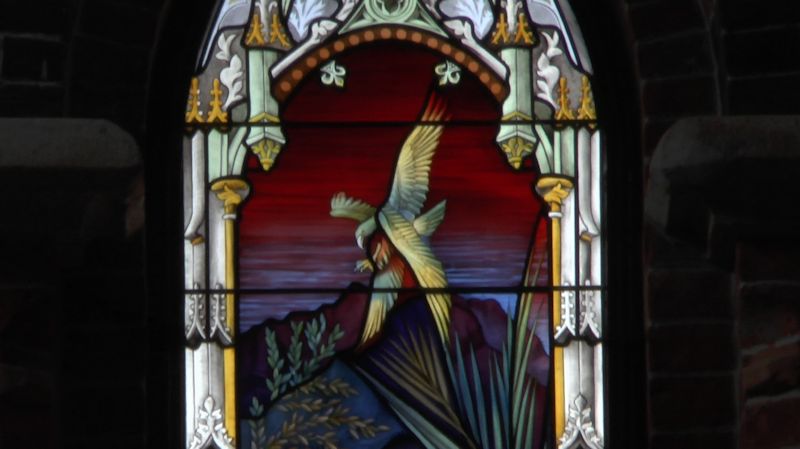 There are representations of vegetation and animals and one in particularly that is not typically seen in traditional stained glass windows.