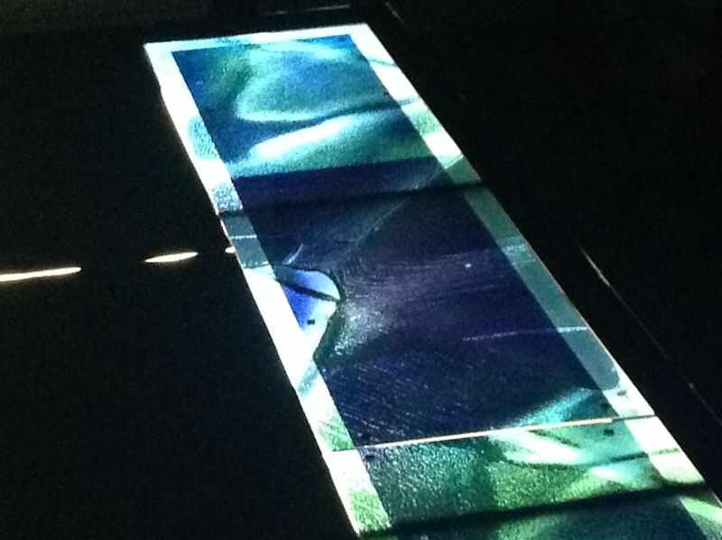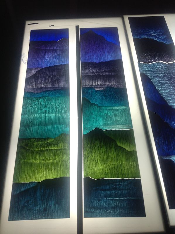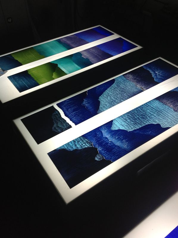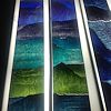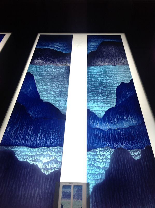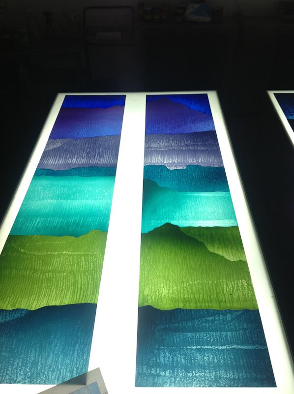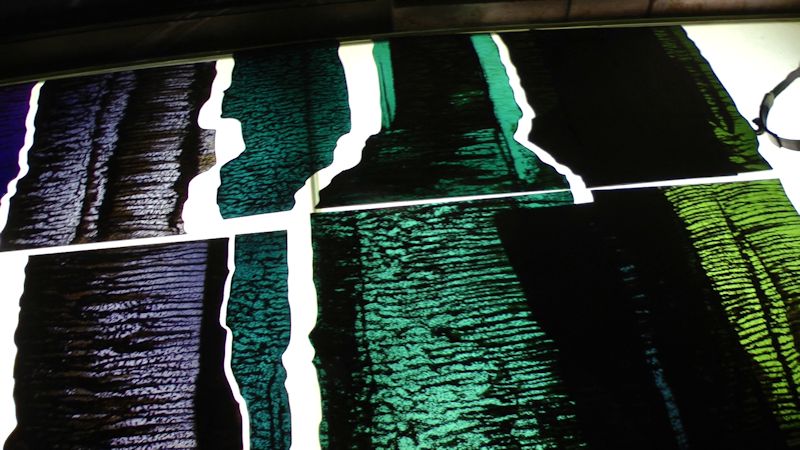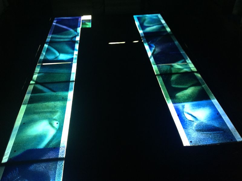 In many ways, a very sad project created under a serious misunderstanding by the client that glass somehow magically glows from within. There were three sets of panels involved, only one has been sort of installed, the long horizontal piece and the other abstract landscapes are not to be seen and may have been destroyed.
